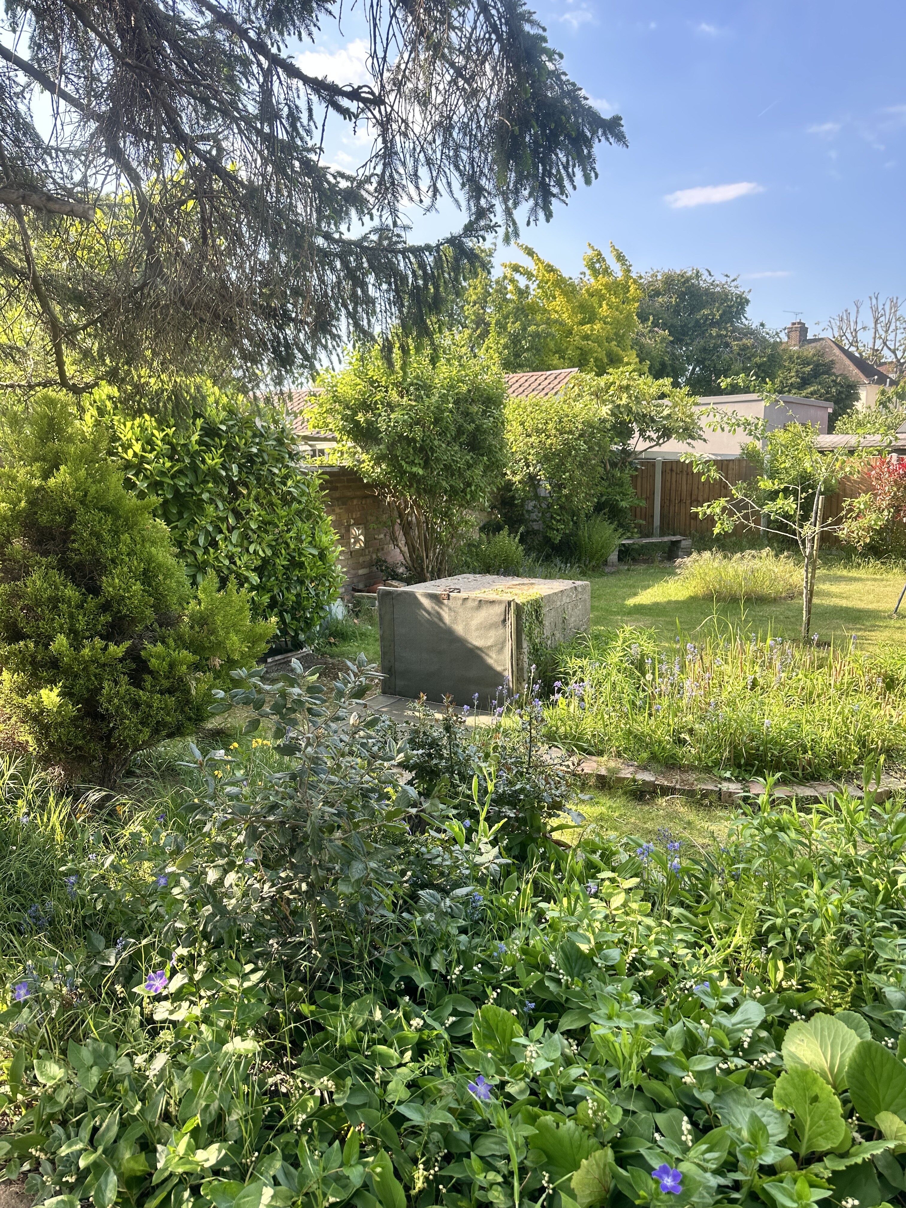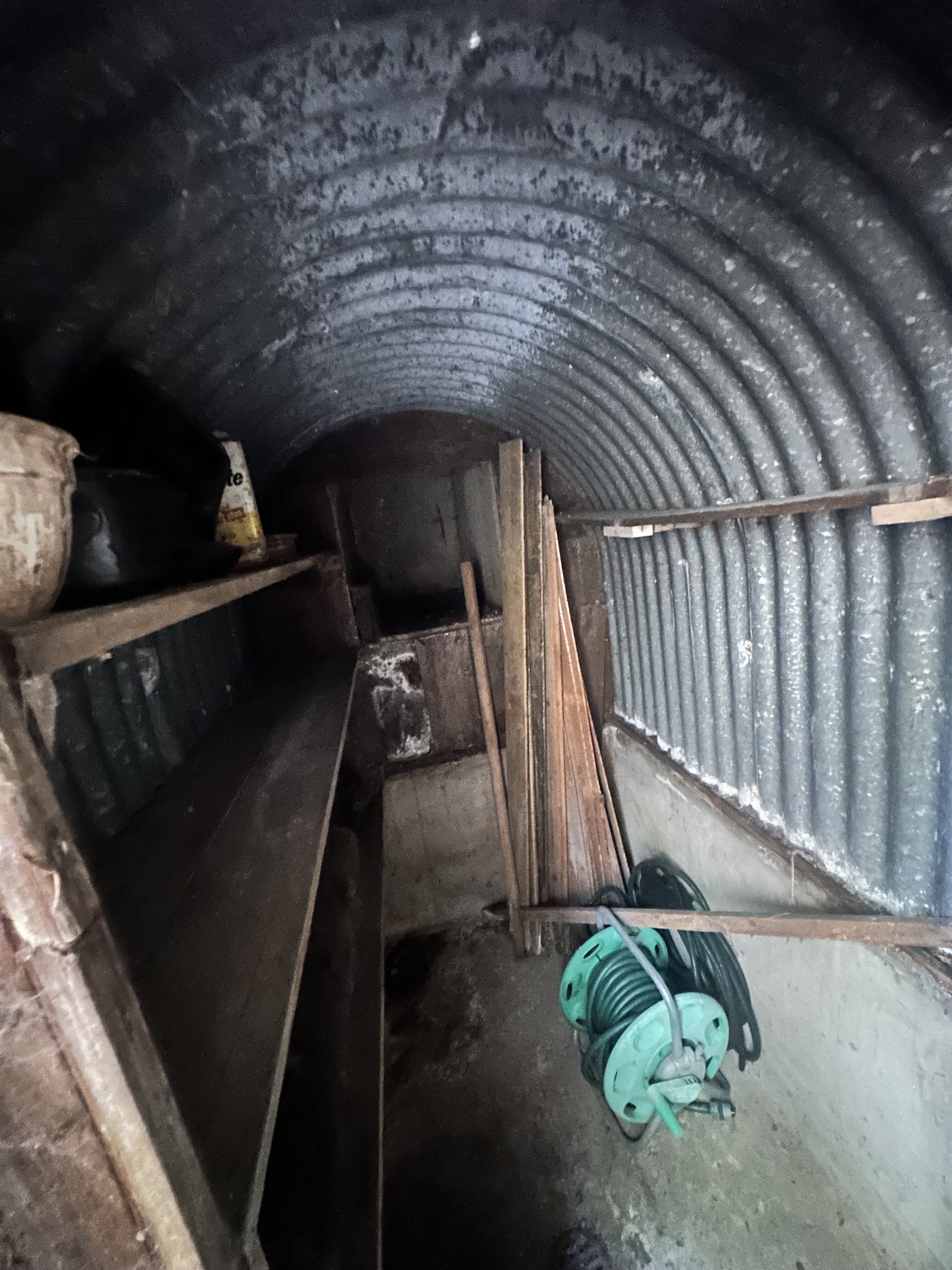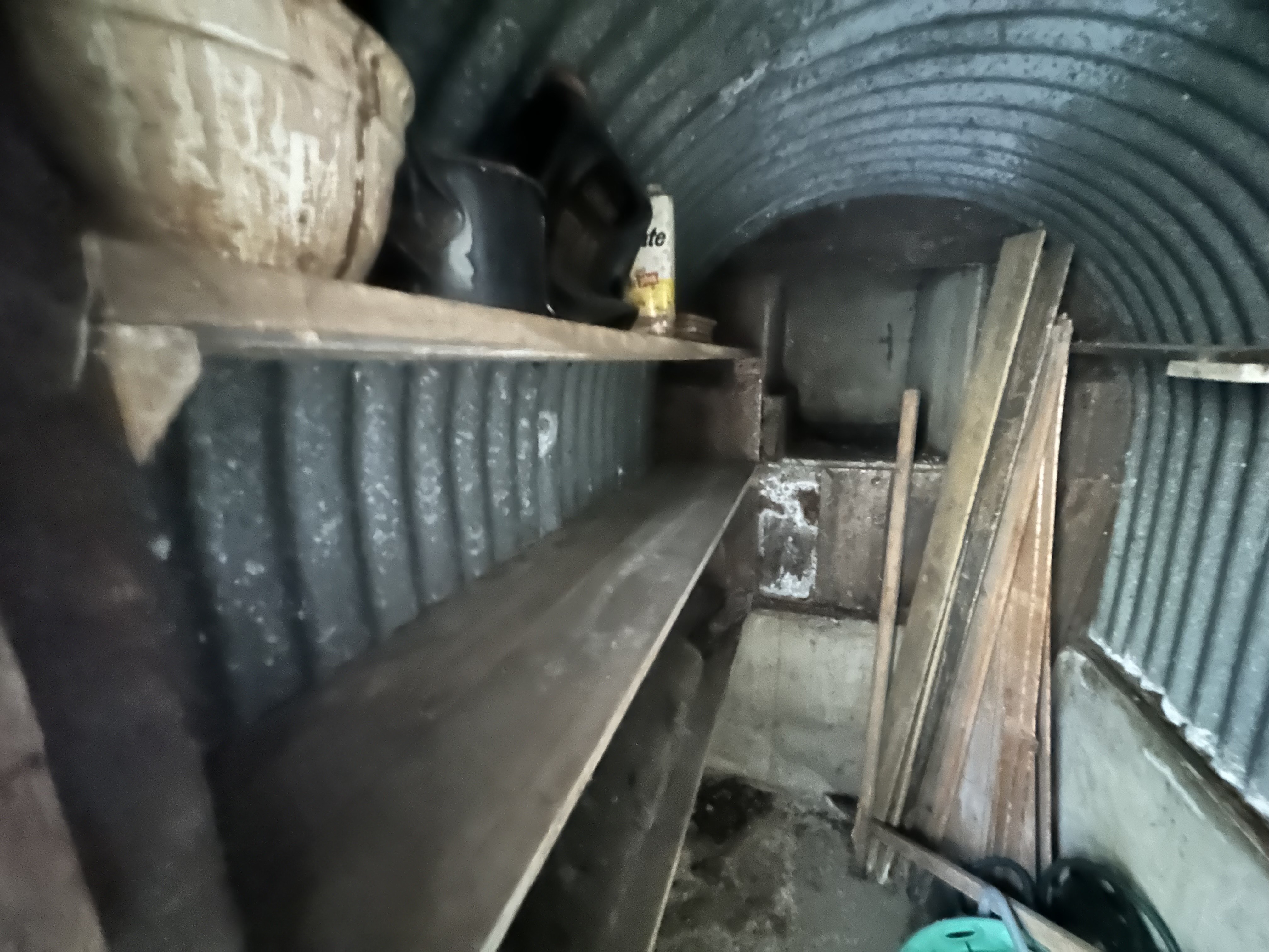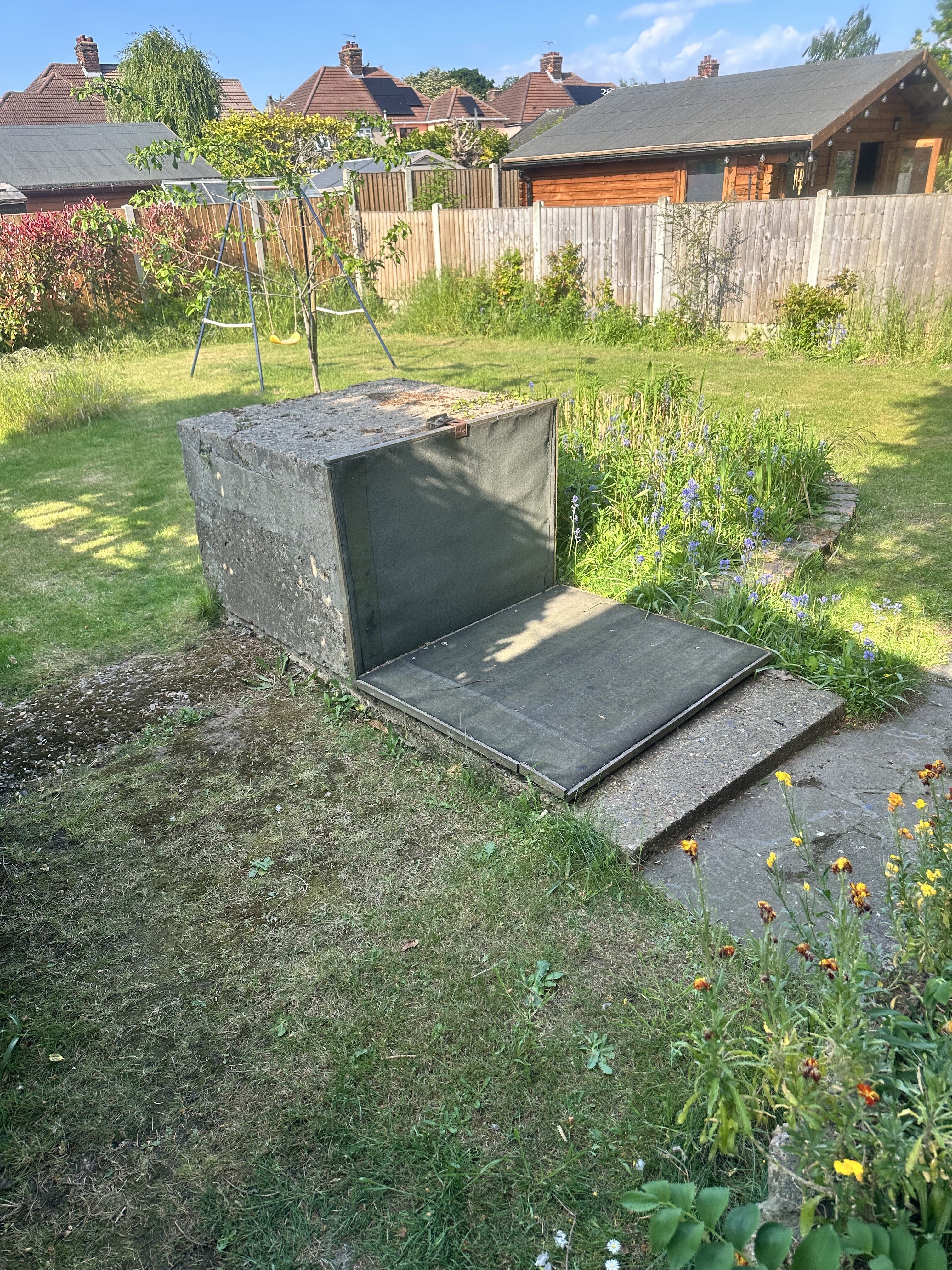 Here is another Anderson Shelter in Grays, Essex. Like most of the other shelters that have survived in their original position, the steel roof of this shelter is firmly set in concrete. And it has a very impressive set of concrete entrance steps and hatch doorway.